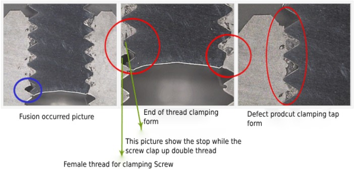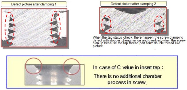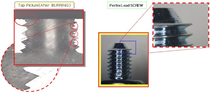 The production cost is down due to reduce the clamping error innovately. Development Background - The purpose of developing this screw prevent the clamping error after improving the screw. Because when the tap manufacture, it happens non-perfect thread clamping phenomenon in double thread(picture) after checking the product section with clamping error in processing